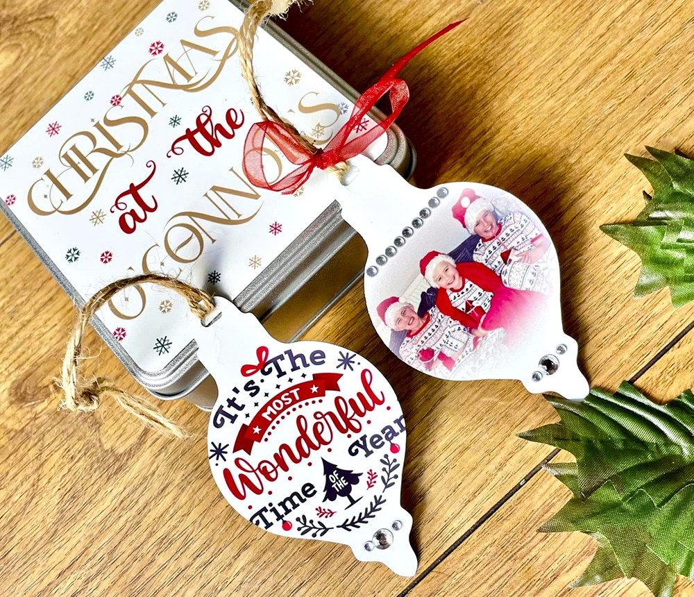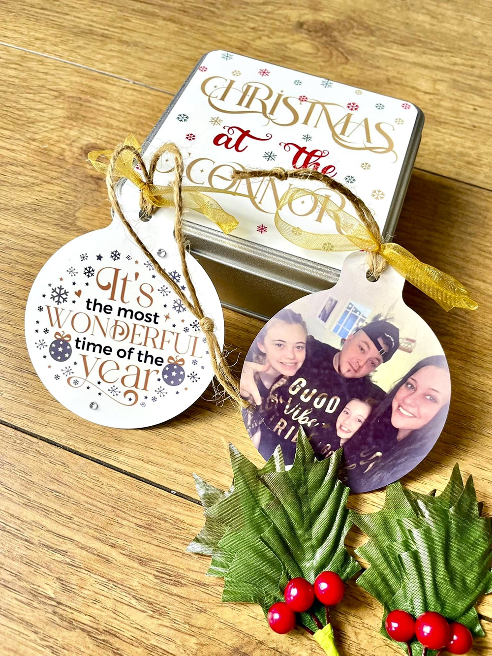 Create some brilliant custom Christmas Decoration Sets – perfect as a gift for anyone! Personalise them with photos and names, dates, artwork, or quotes. Each set contains 8 decorations for you to design and print up in many different ways!
