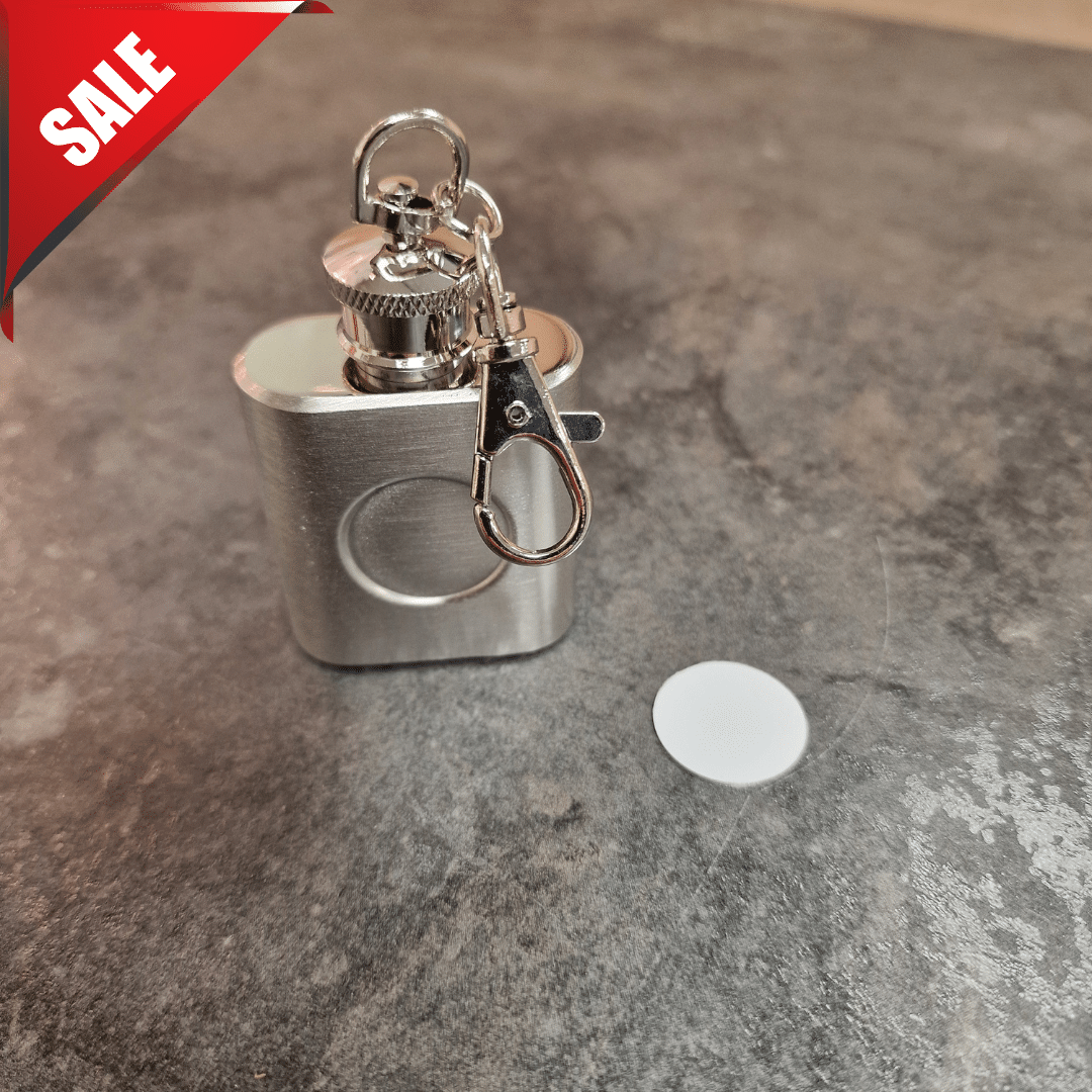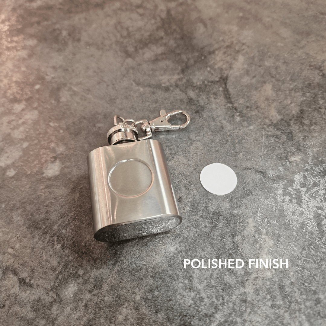 Discounted quality Silver Effect 1oz Hip Flask on a keyring fixing in a choice of two finishes – brushed or polished silver, 60 x 40mm with 20mm slightly convex recess