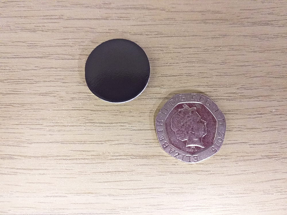 Large Round 89 mm Fridge Magnet supplied with Self adhesive magnetic strip as standard (with magnet style options – strip, squares, circles, 2 strips, 2 squares or 2 circle).