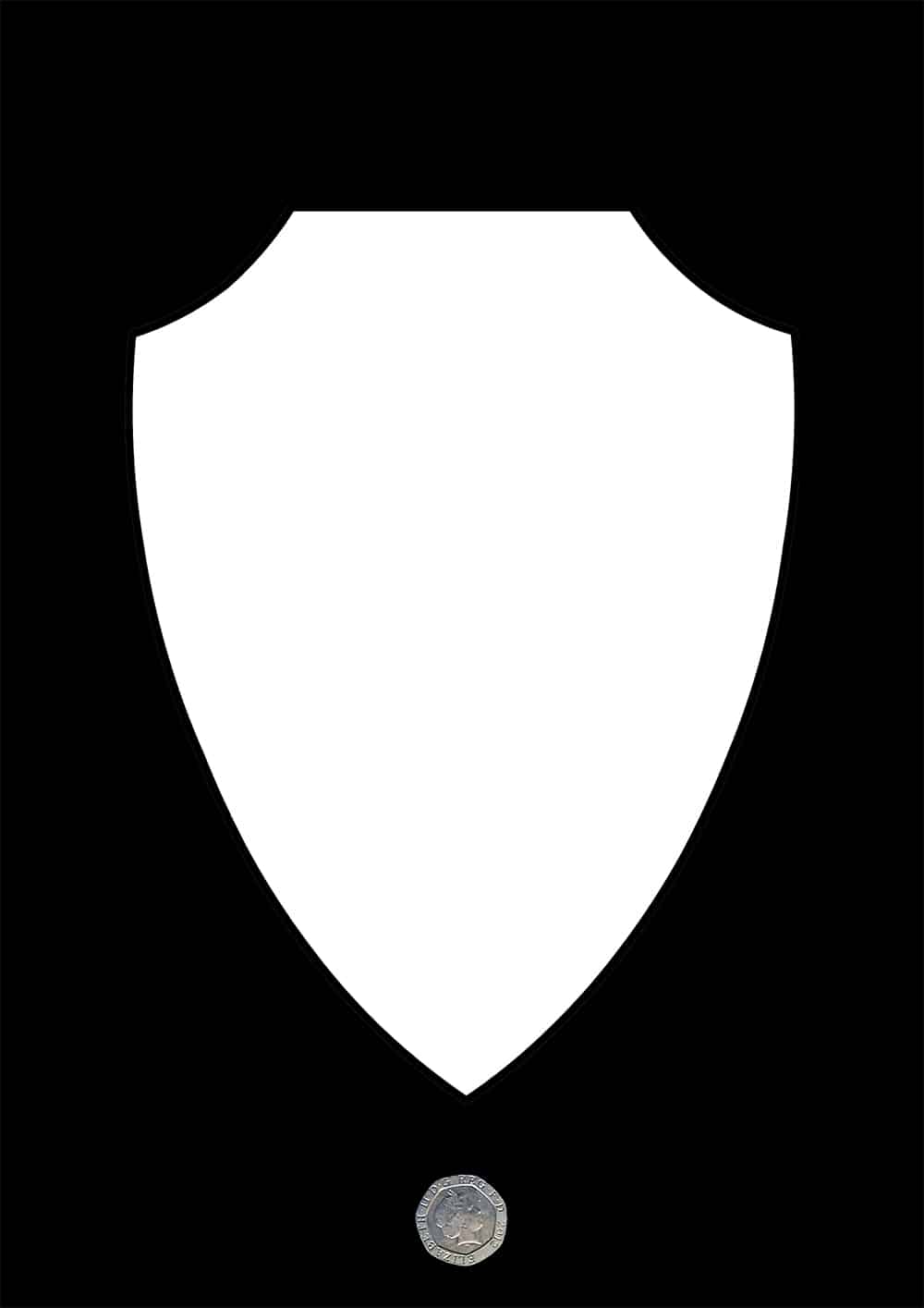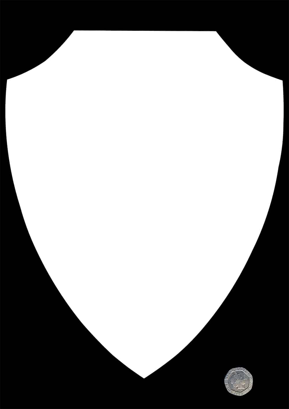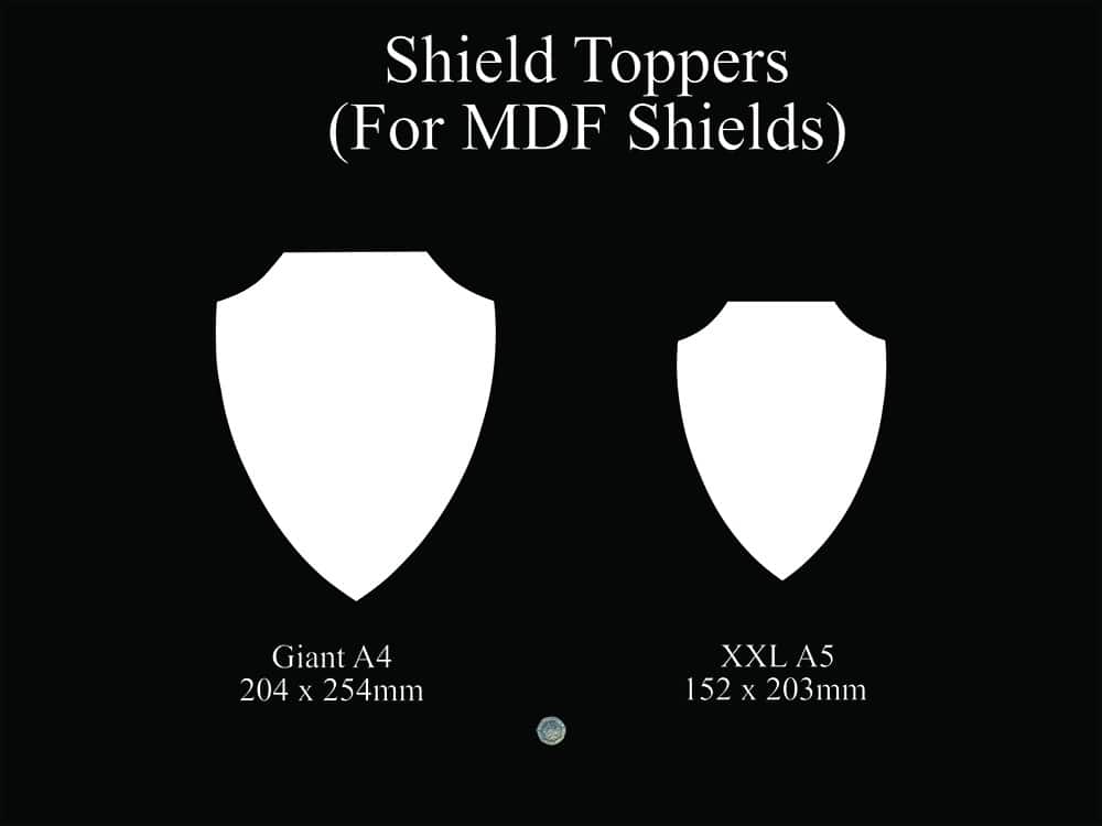 This shield fits as a topper on premium thick MDF shield plaques as an alternative finish, or as a stand alone plaque in 2 sizes: